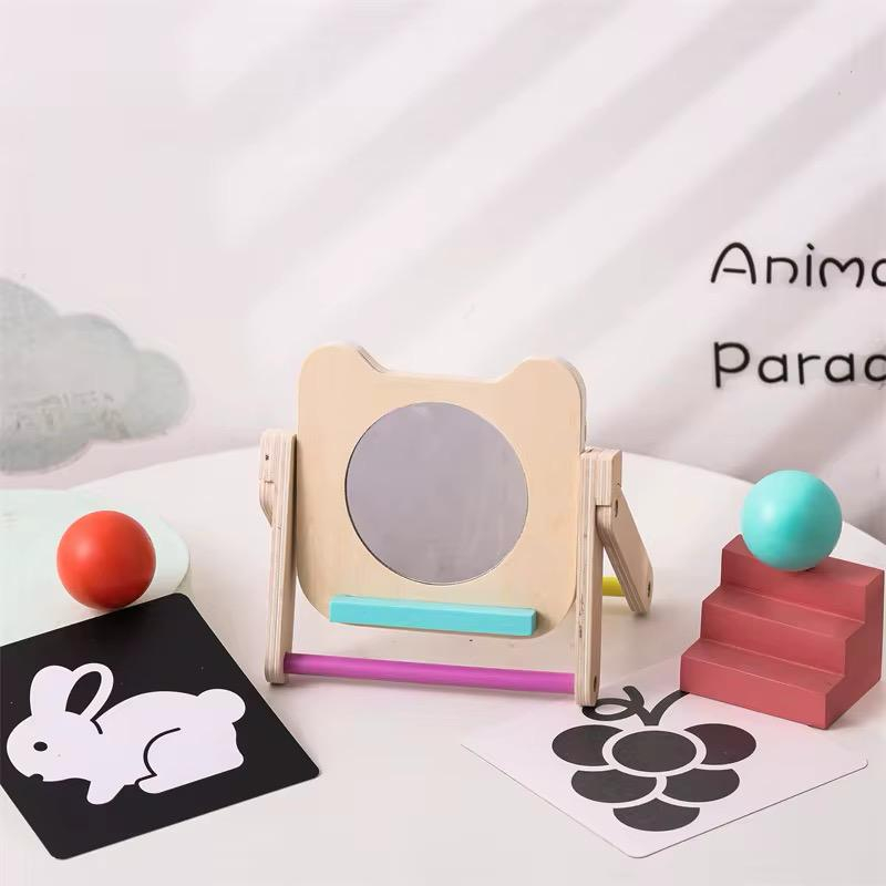 Oglinda cu suport reglabil încurajează timpul petrecut pe burtică (tummy time) și descoperirea propriei imagini – un pas important în dezvoltarea conștiinței de sine