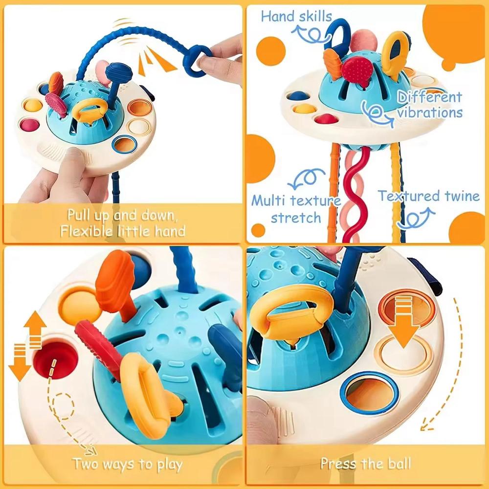 Această jucărie senzorială inovatoare, cu design inspirat din universul cosmic, este special creată pentru bebelușii care încep să exploreze lumea prin atingere, prindere și tragere. Forma de navă spațială cu tentacule lungi, moi și texturate încurajează stimularea multisenzorială și dezvoltarea motricității fine.