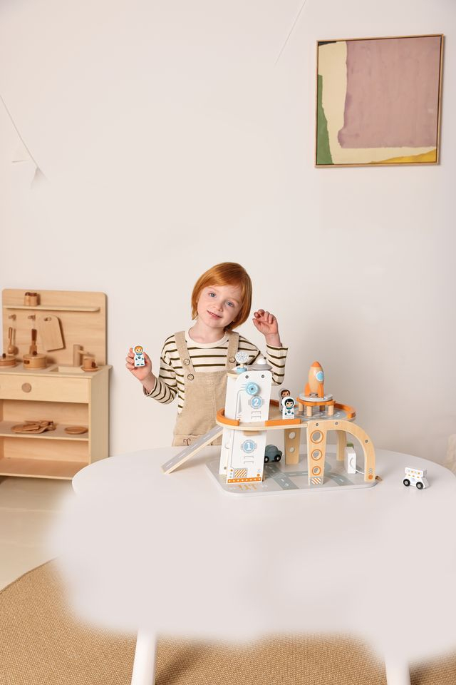 Pregătiți-vă de decolare! Acest set spațial din lemn transformă camera copilului într-o adevărată bază de lansare. Conține rachetă , rampă, vehicule,pompă alimentare ,roboței, extratereștri și astronauți – toate atent ilustrate și construite din lemn de calitate superioară.
