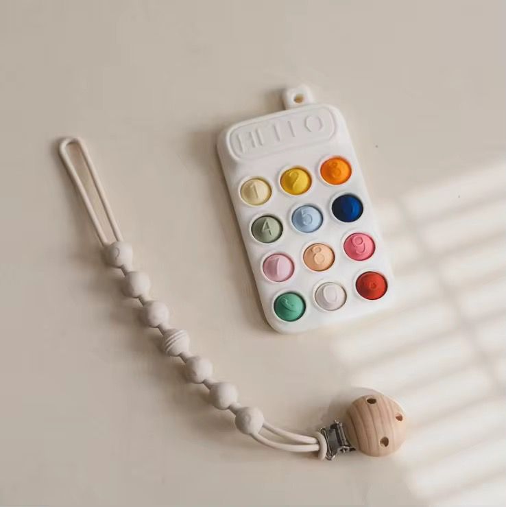 Un telefon de jucărie reinventat pentru bebeluși! Această jucărie interactivă imită un telefon mobil, dar este realizată din silicon moale, cu butoane pop-it colorate și numerotate. Include un lanț din silicon cu clips din lemn, perfect pentru atașare de cărucior, scaun de masă sau marsupiu. Încurajează dezvoltarea tactilă, motrică și senzorială.