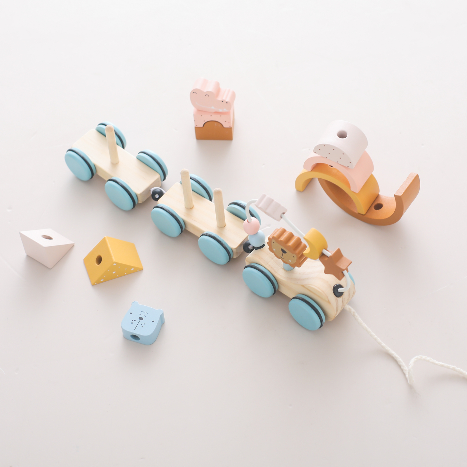 Descoperă un univers pastelat și plin de aventură cu trenulețul educativ din lemn, creat special pentru mânuțele curioase ale celor mici! Această jucărie multifuncțională este o combinație minunată între jocul de tras, sortarea formelor, dezvoltarea motricității și stimularea creativității, totul într-un design blând, sigur și prietenos.