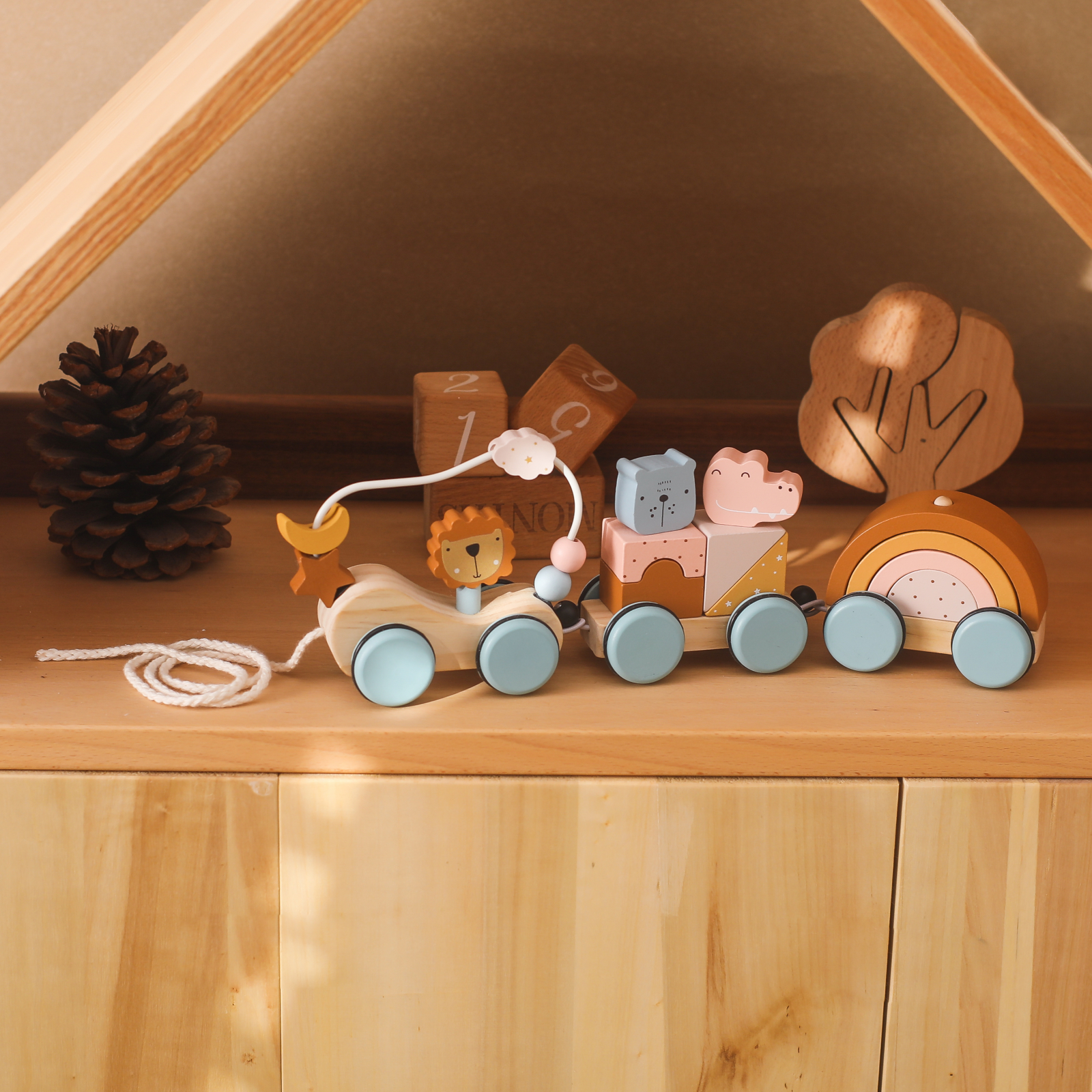 Trenuleț Educativ din Lemn cu Animale și Curcubeu Pastel – Jucărie de Tras, Stivuire și Motricitate