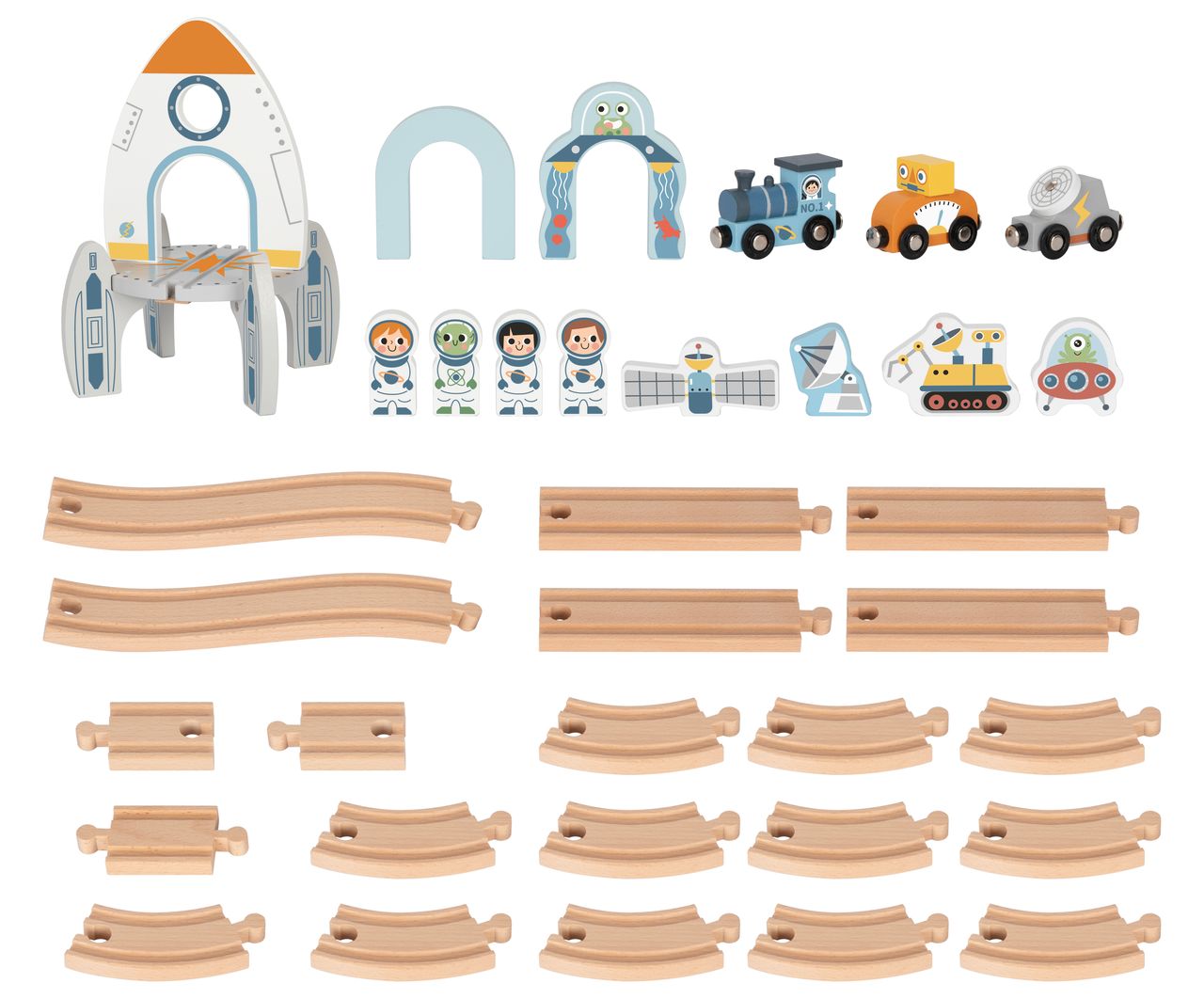 Set Tren Spațial cu șine, astronauți, navetă și figurine tematice din Lemn