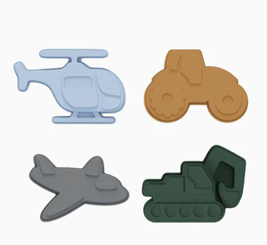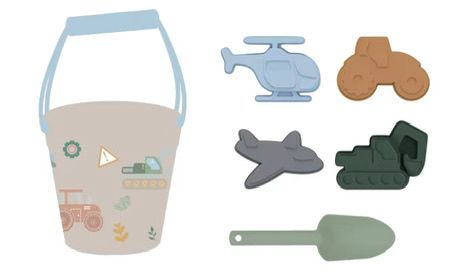 Setul include găletușă, lopățică și forme tematice (elicopter, avion, tractor, excavator), astfel încât copilul poate inventa povești, trasee și misiuni de salvare. Fiecare formă este realizată din silicon moale, fără margini dure – sigur și confortabil pentru mânuțele mici.