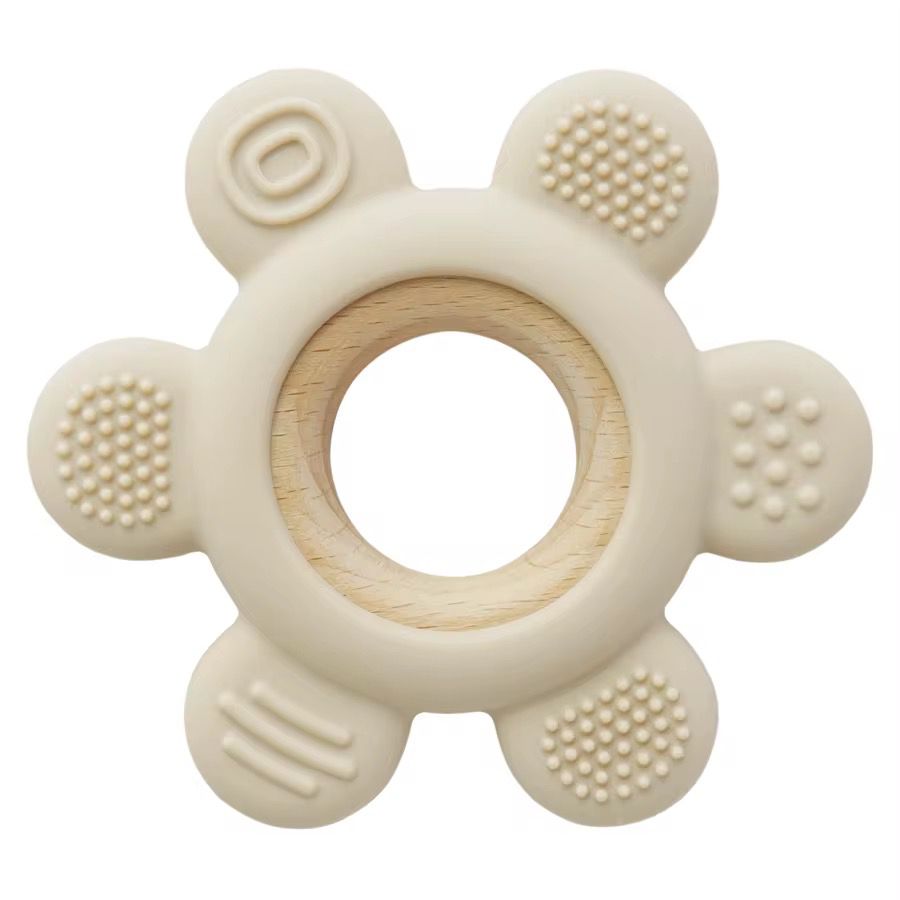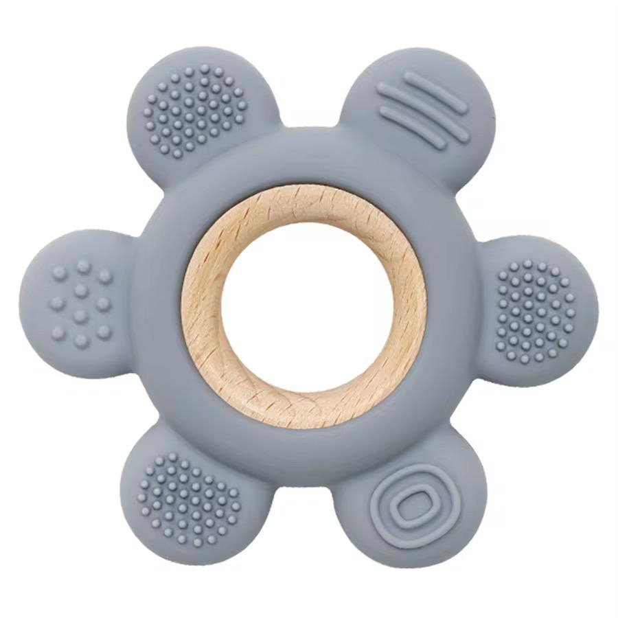 Combinația dintre lemnul dur și siliconul moale ajută la calmarea gingiilor, dar și la explorarea tactilă, dezvoltând simțul atingerii.