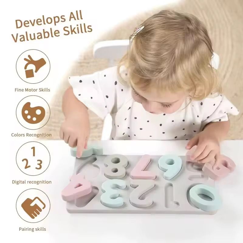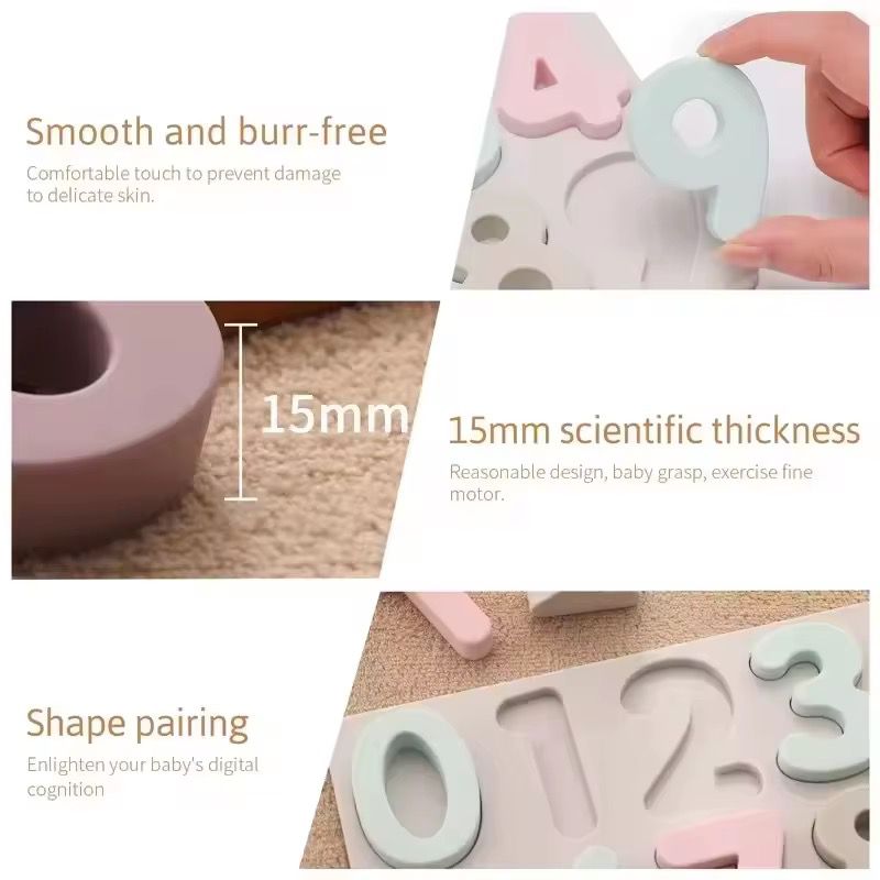 Fiecare cifră este groasă, ușor de prins și poziționat, stimulând motricitatea fină, coordonarea mână–ochi și recunoașterea vizuală. Paleta cromatică pastel oferă o experiență vizuală calmă și armonioasă, potrivită pentru bebeluși și copii mici, fără a suprasolicita simțurile.