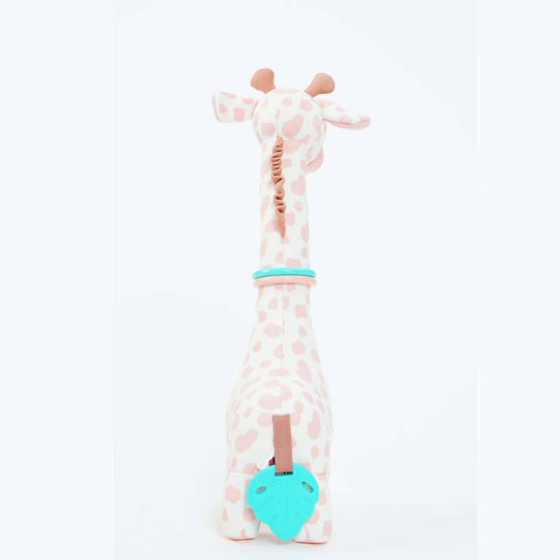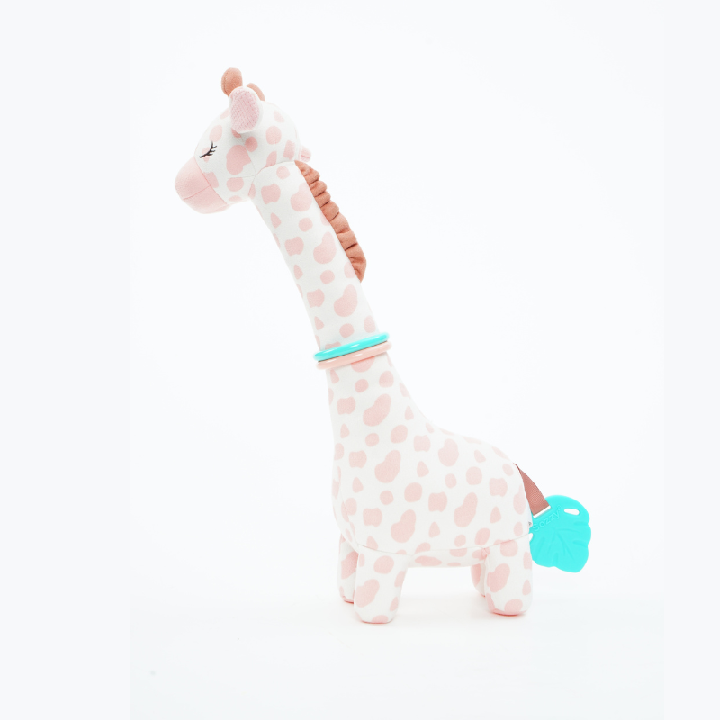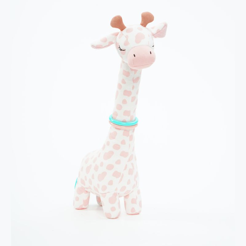 Descoperă una dintre cele mai iubite jucării senzoriale pentru bebeluși – girafa din pluș cu detalii pastel și funcții multiple, concepută special pentru a stimula dezvoltarea armonioasă a micuților.