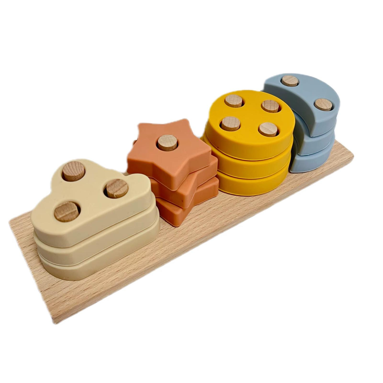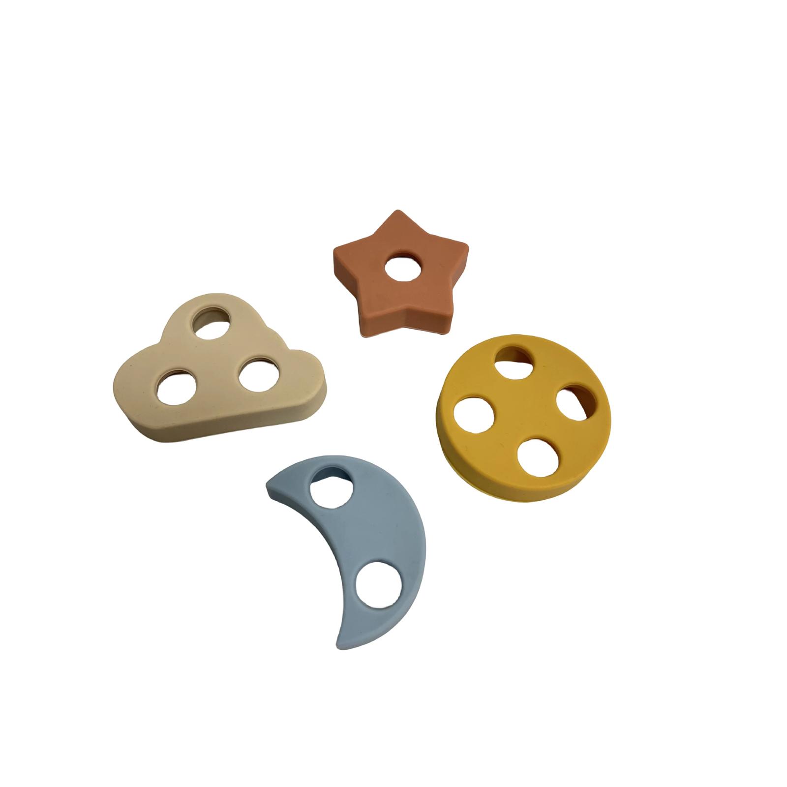 Piesele au forme geometrice diferite – cercuri, stele, norișori, semilune – și vin în nuanțe calde, perfect alese pentru a stimula vizual bebelușii fără a-i suprasolicita.  Materiale sigure și durabile .